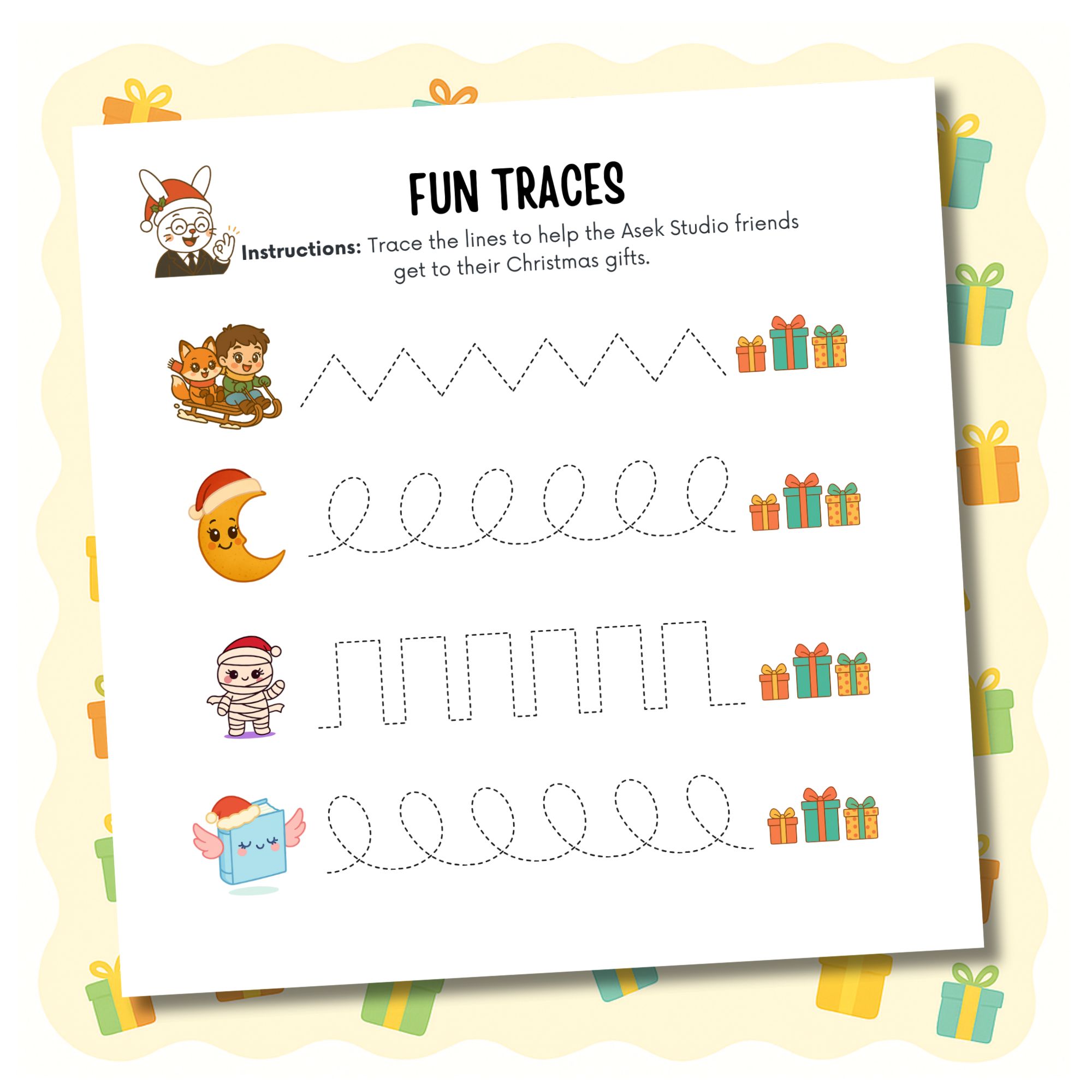 Aquest quadern d’activitats de Nadal està especialment dissenyat per a nens i nenes de 3 a 5 anys, amb les adorables il·lustracions de l’univers Asek Studio… i amb Mr. Rabbinsky com el seu professor! 🐰🎅