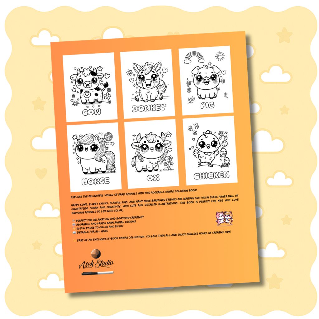 Tant si és per aniversaris, festes o un dia tranquil a casa, aquest llibre per acolorir d’animals de granja kawaii és un regal perfecte per a nens i nenes que estimen els animals, la creativitat i les aventures a la granja.