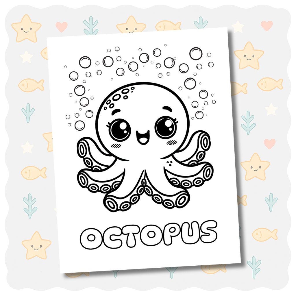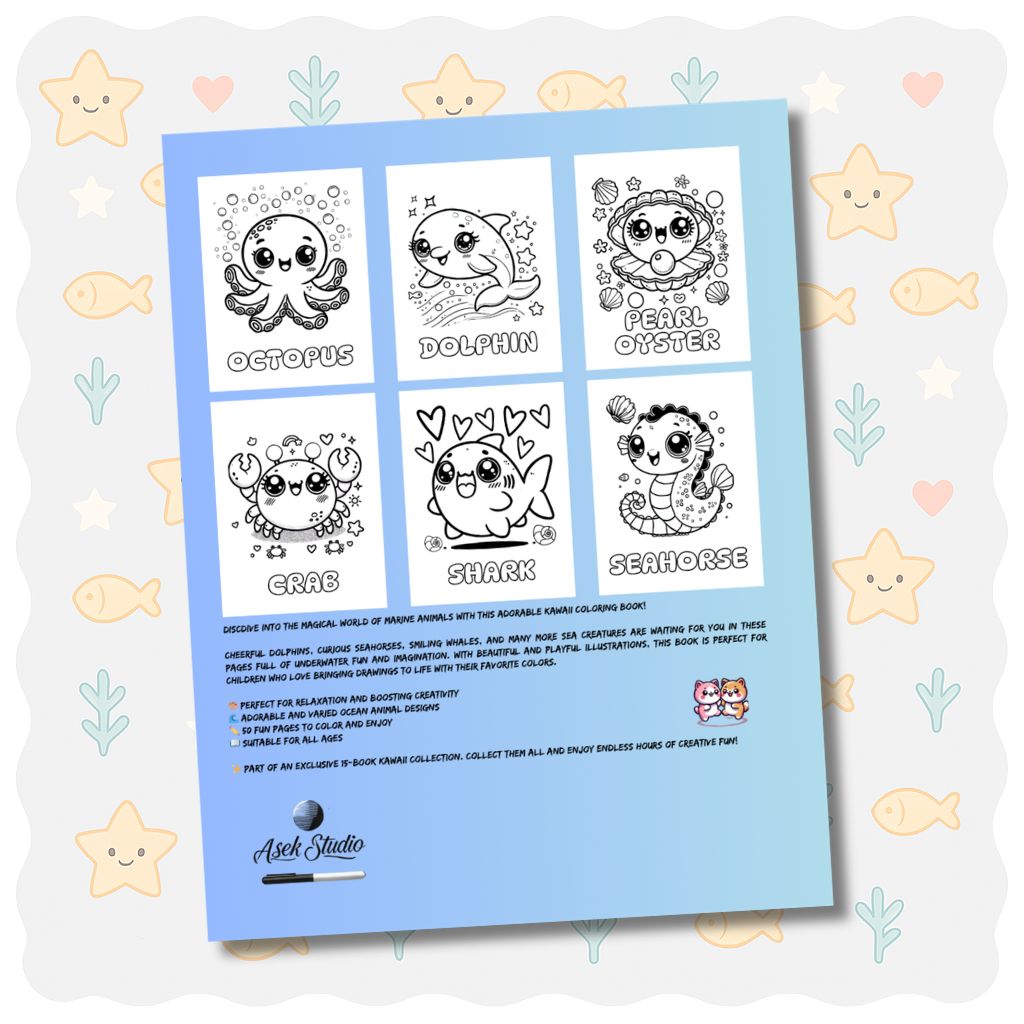 Aquest llibre per acolorir kawaii està ple de amics de l’oceà adorables com dofins somrients, pops feliços, tortugues marines dolces, meduses i molt més! Perfecte per a petits artistes que estimen el mar i acolorir criatures màgiques submarines.
