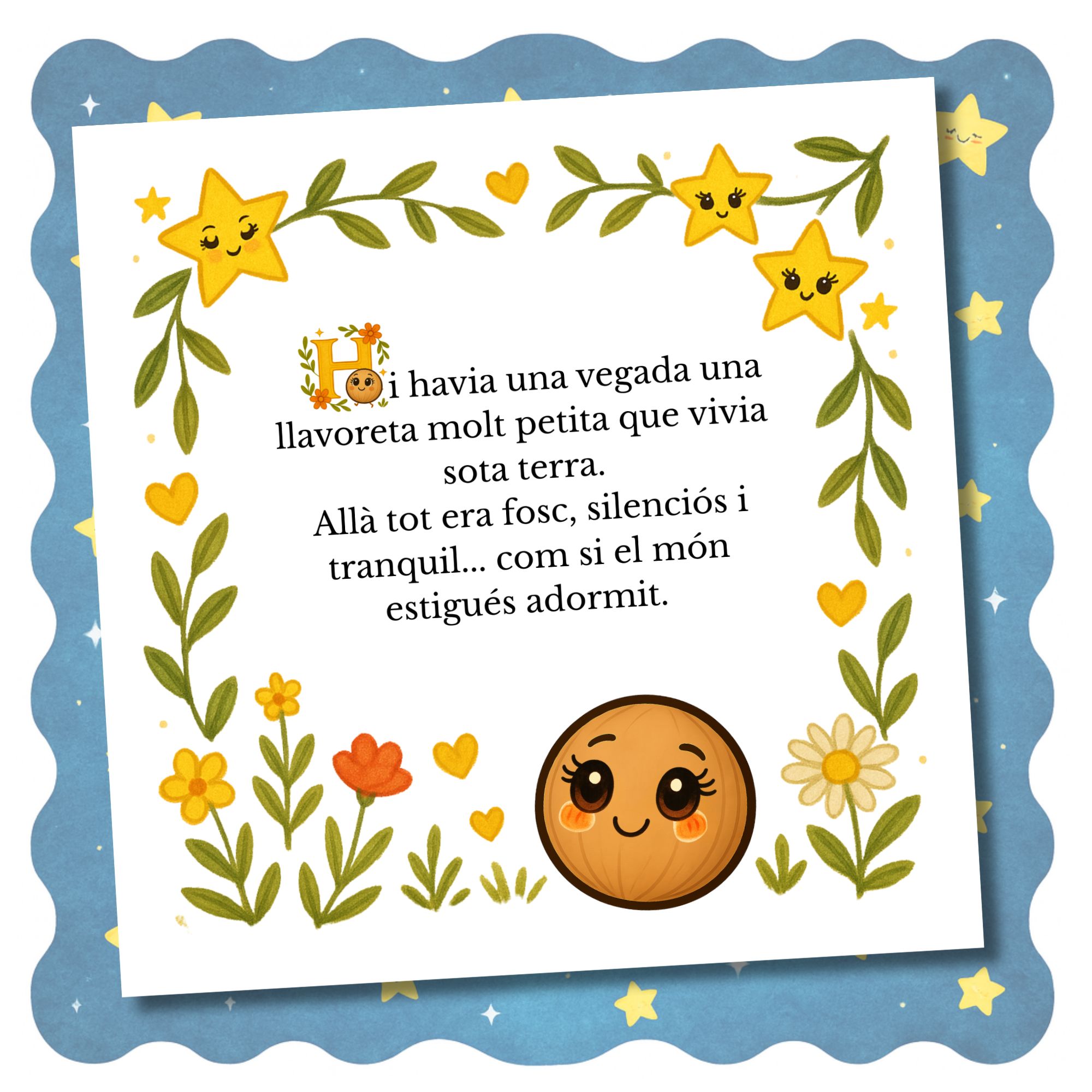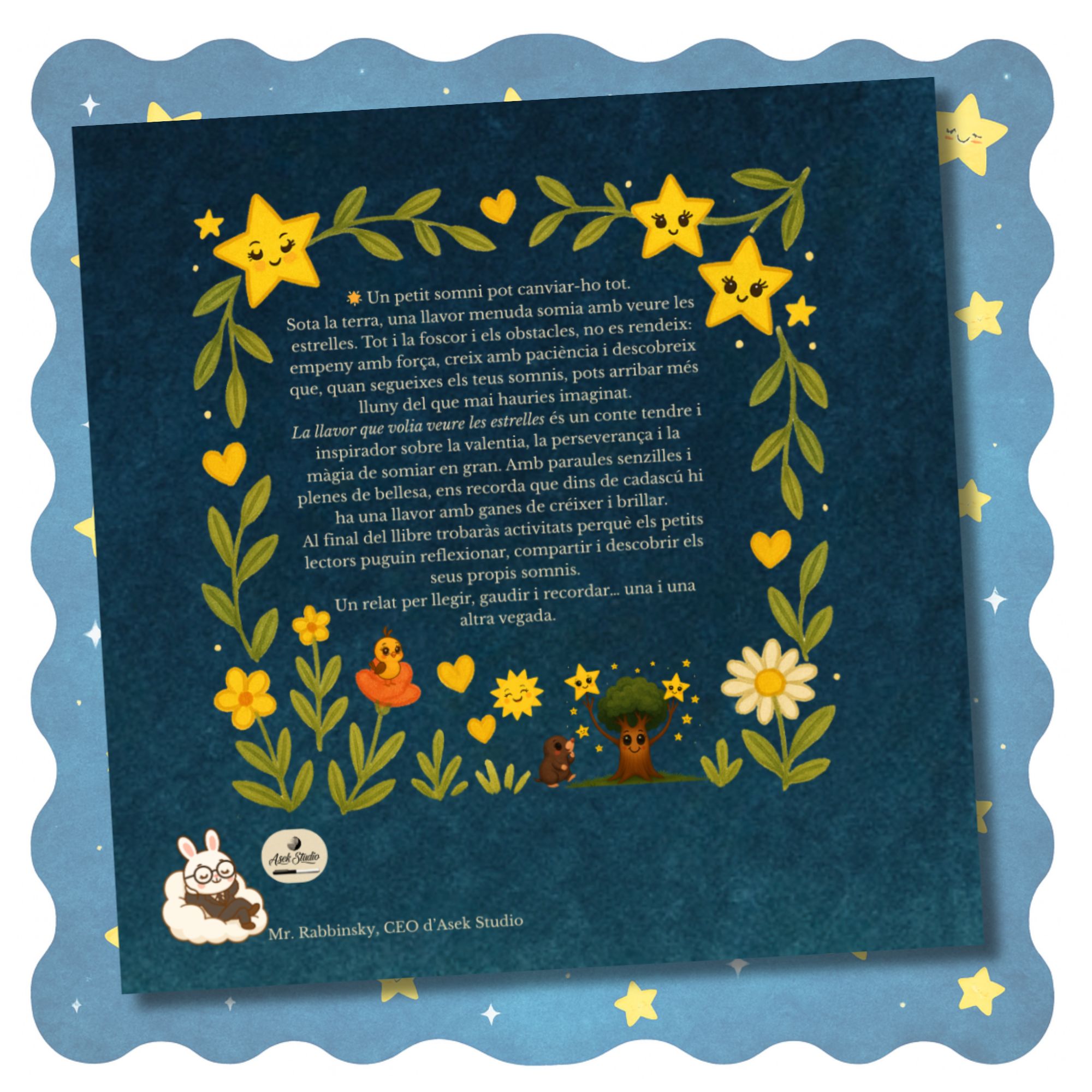 La llavor que volia veure les estrelles és un conte infantil tendre i inspirador sobre la valentia, l’esperança i la perseverança. Amb paraules senzilles i imatges poètiques, ens recorda que dins de cada nen i nena hi ha una llavor amb ganes de créixer, florir i brillar amb llum pròpia.