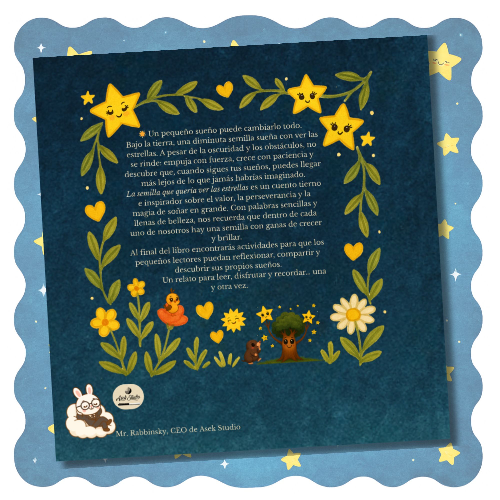 La semilla que quería ver las estrellas és un conte infantil tendre i inspirador sobre el valor, l’esperança i la perseverança. Amb paraules senzilles i imatges poètiques, ens recorda que dins de cada nen i nena hi ha una llavor amb ganes de créixer, florir i brillar amb llum pròpia.