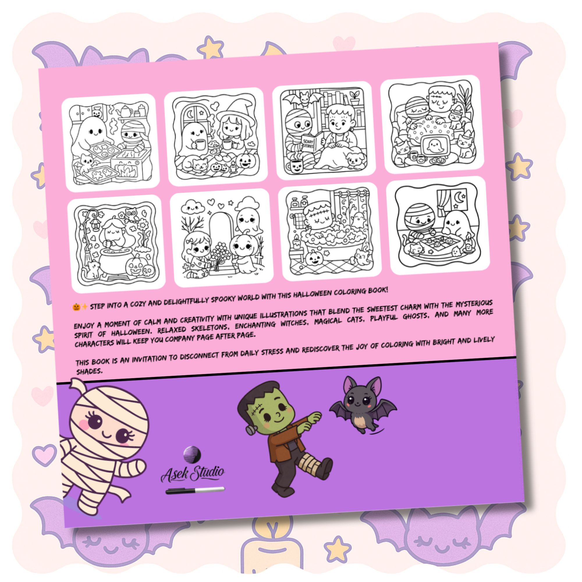 ✨ Aquest llibre és una invitació a desconnectar de l’estrès diari i redescobrir l’alegria de pintar amb tons vius i brillants. Omple cada pàgina amb els teus colors preferits i deixa que la màgia de Halloween cobri vida!